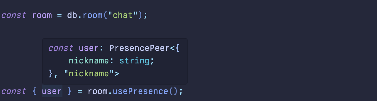 import { init } from '@instantdb/react'; // Visit https://instantdb.com/dash to get your APP_ID :) const APP_ID = '__APP_ID__'; const db = init({ appId: APP_ID }); const room = db.room('chat', 'hacker-chat-room-id'); const randomId = Math.random().toString(36).slice(2, 6); const user = { name: `User#${randomId}`, }; function App() { const { user: myPresence, peers, publishPresence, } = db.rooms.usePresence( room, // Publish your presence when you join the room { initialPresence: { name: user.name } }, ); // Update your presence when your name changes useEffect(() => { publishPresence({ name: user.name }); }, [user.name]); if (!myPresence) { return <p>App loading...</p>; } return ( <div> <h1>Who's online?</h1> <p>You are: {myPresence.name}</p> <h2>Others:</h2> <ul> {/* Loop through all peers and render their names. Peers will have the same properties as what you publish to the room. In this case, `name` is the only property we're publishing. Use RoomSchema to get type safety for your presence object. */} {Object.entries(peers).map(([peerId, peer]) => ( <li key={peerId}>{peer.name}</li> ))} </ul> </div> ); }